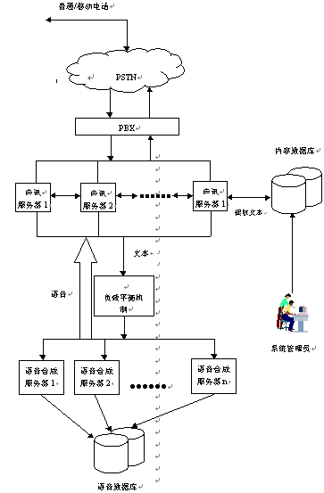 當(dāng)用戶通過(guò)電話向聲訊服務(wù)器發(fā)出請(qǐng)求時(shí),聲訊服務(wù)器會(huì)首先作出分析判斷,然后從內(nèi)容數(shù)據(jù)庫(kù)中提取相應(yīng)的文本信息,經(jīng)過(guò)負(fù)載平衡機(jī)制發(fā)送給語(yǔ)音合成服務(wù)器。語(yǔ)音合成服務(wù)器在接收到文本后立刻開始合成,同時(shí)將合成好的語(yǔ)音發(fā)送回語(yǔ)音服務(wù)器,再由語(yǔ)音服務(wù)器回傳給用戶。其中內(nèi)容數(shù)據(jù)庫(kù)中的信息可以由系統(tǒng)管理員定期進(jìn)行維護(hù)管理。(系統(tǒng)連接結(jié)構(gòu)見流程圖)