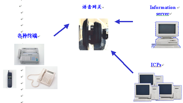 在這樣的體系結(jié)構(gòu)中,各種終端通過PSTN網(wǎng)絡(luò)聯(lián)接到語音網(wǎng)關(guān),而通過語音網(wǎng)關(guān)來訪問后臺的數(shù)據(jù)服務(wù)、應(yīng)用服務(wù),或者通過互聯(lián)網(wǎng)絡(luò)訪問各個(gè)語音ICP。