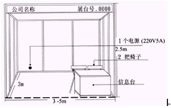 標(biāo)準(zhǔn)展臺(tái)價(jià)格包括三面墻板(邊角展臺(tái)為兩面墻板)、楣板及中英文公司名稱、5安培電源、地毯、兩只日光燈(15平方米展臺(tái)為三只日光燈)、一個(gè)信息臺(tái)、兩把椅子、一個(gè)廢紙簍。