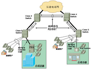 從傳統(tǒng)上講,一個企業(yè)的電話網(wǎng)絡(luò)由一個個孤立的電話系統(tǒng)。如下圖所示。企業(yè)總部同下面分公司的電話通過電話服務(wù)商來提供。企業(yè)要付昂貴的電話費,并且企業(yè)能否有一些特殊的電話需求很大程度受服務(wù)商的限制。