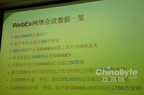 網(wǎng)絡(luò)會議在中國普及率還相對滯后,不同行業(yè)的跨度也不一樣,用WebEx做什么也有差異。制造業(yè)和高科技領(lǐng)域使用最廣,因為他們喜歡學(xué)習(xí)使用高科技。目前正在向其他領(lǐng)域擴展。比如目前阿里巴巴在用,也在慢慢擴展到金融等行業(yè)。