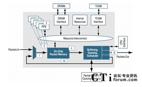 第一代QuantumFlow處理器(QFP)使用90nm工藝, QFP擁有40個定制QFP數(shù)據(jù)包處理引擎(PPE),每個PPE支持4個執(zhí)行線程。利用多達160個并行運行的獨立處理器線程,平均每線程功耗僅0.51W, 遠低于業(yè)界平均水平。同時QFP提供了一個高速的多核互聯(lián)總線,確保每個內核都能及時快速的訪問到相關的資源,并且能夠避免在不夠先進的硬件架構中常見的CPU過度使用和超長延遲問題,而傳統(tǒng)的網(wǎng)絡處理器架構僅有少量的內核,因此需要使用交換矩陣或總線將多塊網(wǎng)絡處理器互聯(lián)才能達到和QFP相同的處理速度,其功耗遠高于QFP系統(tǒng),而多塊網(wǎng)絡處理器資源互相訪問將會帶來大量的數(shù)據(jù)包延遲。