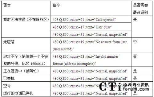 從歸納的情況看,只有無應(yīng)答和地址不全兩種情況是可靠信令分析來識(shí)別的,其他的5種情況都無法通過信令檢測(cè)識(shí)別。特別是暫時(shí)無法接通的語言提示,播放完提示音有3種不同的信令,應(yīng)該是屬于不同的情況,但是放了相同的語音。因此造成號(hào)碼識(shí)別錯(cuò)誤的現(xiàn)象。