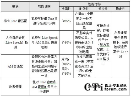 圖中,Tone音匹配采用模式匹配方法,可以實(shí)現(xiàn)對(duì)振鈴音,忙音,空號(hào),不可達(dá)音等100多種標(biāo)準(zhǔn)提示音的識(shí)別。AM(Answering Machine)音匹配主要負(fù)責(zé)識(shí)別傳真機(jī)、自動(dòng)答錄機(jī)等機(jī)器語音,同樣采用模式匹配方法,將收到的語音與標(biāo)準(zhǔn)樣本庫進(jìn)行比對(duì)。人類自然語音檢測(cè)的功能主要通過人真實(shí)聲音的檢測(cè),來判斷是否需要進(jìn)行語音匹配。