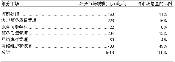如圖二所示, 2000年, 在美國的固定網(wǎng)OSS服務(wù)保障市場的六個細(xì)分市場中, 規(guī)模最大的是網(wǎng)絡(luò)維護(hù)和恢復(fù)市場, 市場總額約為7.38億美元, 占整個市場的49%; 而規(guī)模最小的是網(wǎng)絡(luò)庫存管理市場, 市場總額約為6千萬美元, 僅占整個市場的4%左右。