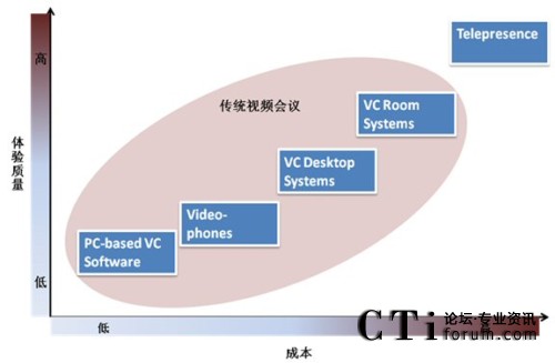 網(wǎng)真產(chǎn)品與企業(yè)的其他視覺溝通產(chǎn)品不同,不同于以軟件為基礎(chǔ)的視頻通信應(yīng)用、電話視頻、以硬件為基礎(chǔ)的桌面視頻系統(tǒng)及群體視頻會(huì)議等各類傳統(tǒng)視頻系統(tǒng)。Frost & Sullivan 咨詢顧問楊梅從體驗(yàn)質(zhì)量及成本兩個(gè)緯度對目前市場上的視頻會(huì)議系統(tǒng)產(chǎn)品進(jìn)行了深入比較,發(fā)現(xiàn)網(wǎng)真在體驗(yàn)質(zhì)量上要明顯高于其他產(chǎn)品,然而其在部署成本上同樣要高于其它產(chǎn)品,這也是目前網(wǎng)真產(chǎn)品推廣中遇到的較大問題。如何能使客戶真正了解建立虛擬互動(dòng)社區(qū)的需求,如何從貴族化走向平民化成為其蓬勃發(fā)展的關(guān)鍵。