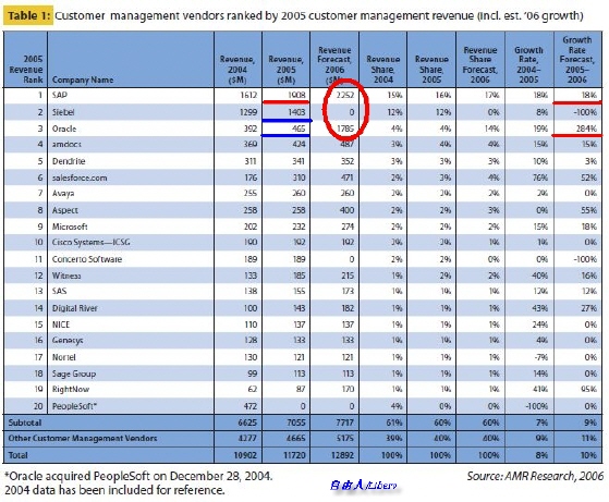 從圖中可以看出,2005年SAP CRM的全球營(yíng)收為19.08億美元,Oracle+Siebel(PeopleSoft已計(jì)入Oracle)CRM的全球營(yíng)收為18.69億美元,落后于SAP CRM。ARM Research的預(yù)計(jì),SAP CRM在2006的營(yíng)收將達(dá)22.52億美元,而Oracle Siebel則只有17.85億美元。