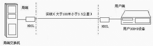 目前30B+D有兩種接入方式,除了圖1所示的光纜接入方式外,還有一種是高比特用戶數(shù)字線(HDSL)方式,如下圖所示。
