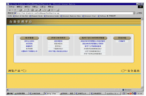 ebanswers分銷系統(tǒng)的一個重要特色就是自助管理平臺,用戶可以在這個平臺中完成絕大部分管理、查詢和統(tǒng)計的工作。自助管理平臺主要有四大部分組成:帳號管理、公司下訂單和庫存管理、帳號下訂單和庫存管理、其他功能。其中帳號管理主要是管理與公司和帳號有關的各類信息,公司下訂單和庫存管理、帳號下訂單和庫存管理這兩個部分主要是用來查詢和統(tǒng)計各項信息的。