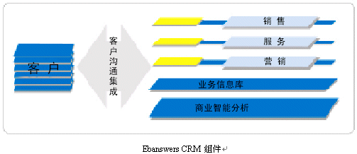 。。作為企業(yè)級客戶關(guān)系全面解決方案,Ebanswers CRM包含了可無縫整合又可獨(dú)立運(yùn)行的三個(gè)功能組件:銷售,營銷,服務(wù)流程自動化軟件系統(tǒng);客戶溝通集成信息化方案;深層商業(yè)智能分析。其中客戶溝通層組體是Ebanswers