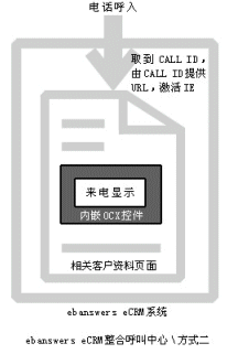 。。Ebanswers CRM整合呼叫中心的這種方式過程更清晰,當(dāng)有電話呼入系統(tǒng)時(shí),由內(nèi)嵌的OCX控件取到call