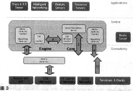 連接層由3個(gè)關(guān)鍵部分組成:用戶設(shè)備、媒體網(wǎng)關(guān)和IP傳輸。ENGINE解決方案的媒體網(wǎng)關(guān)可以支持從很小數(shù)量的用戶擴(kuò)展到數(shù)百萬(wàn)用戶。本地交換機(jī)、匯接交換機(jī)和用戶交換機(jī)可以接入到媒體網(wǎng)關(guān)。多媒體用戶可通過(guò)SIP終端和IAD接入。ENGINE支持采用V5、ISUP、SIP和H.248等各種接入節(jié)點(diǎn)的用戶。在ENGINE解決方案中,媒體網(wǎng)關(guān)同時(shí)也是接入網(wǎng)關(guān),可以實(shí)現(xiàn)C5電話業(yè)務(wù)和基于SIP的寬帶用戶功能。
