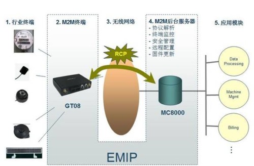 所有的M2M方案都具有的五要素是行業(yè)終端、M2M終端、無(wú)線傳輸網(wǎng)絡(luò)、M2M后臺(tái)服務(wù)器以及應(yīng)用模塊。為了能快速有效及低成本地適應(yīng)M2M市場(chǎng)上各種各樣的行業(yè)應(yīng)用,愛(ài)立信提出智能平臺(tái)EMIP的概念(如圖所示)。該智能平臺(tái)由GT08系列終端和MC8000管理服務(wù)器組成。