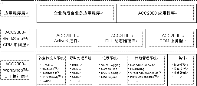 ACC2000 Workshop是聲訊科技集團為基于Microsoft Windows操作系統(tǒng)的CRM應用軟件開發(fā)所建立的開發(fā)平臺(中間件)。以ACC2000 Workshop為基礎的ACC2000集成多媒體溝通中心采用三層結(jié)構,利用ACC2000 Workshop的CRM中間層所提供的ActiveX控件、DLL動態(tài)庫以及COM組件,就可以很容易地將溝通中心的各種功能融合到前端應用程序中。ACC2000 Workshop的CTI執(zhí)行層接受中間件發(fā)來的請求,處理ACC2000的各項服務功能,并向CRM應用程序返回執(zhí)行結(jié)果。見下圖。