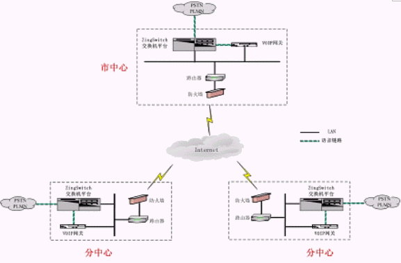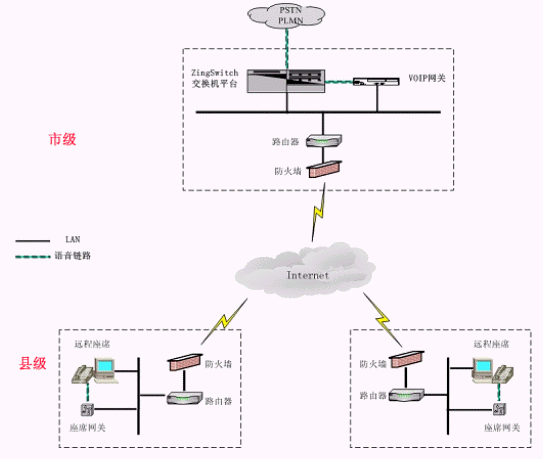 系統(tǒng)在市中心點(diǎn)和分布的遠(yuǎn)程座席所在縣市區(qū)分別部署相應(yīng)的VoIP網(wǎng)關(guān),市中心和各個(gè)縣市區(qū)都通過互聯(lián)網(wǎng)進(jìn)行連接和語音傳輸,客戶與遠(yuǎn)程座席之間的交流與普通的集中座席員之間毫無區(qū)別,遠(yuǎn)程座席只相當(dāng)于ZingSwitch交換機(jī)的一個(gè)遠(yuǎn)程分機(jī)。