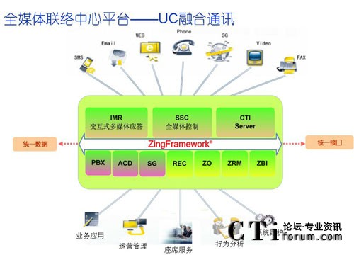 英立訊公司ZingFramework®®全媒體聯(lián)絡(luò)中心平臺(tái)基于H.323和SIP等國(guó)際標(biāo)準(zhǔn)協(xié)議,通過(guò)SOA服務(wù)架構(gòu)實(shí)現(xiàn)聯(lián)絡(luò)中心的優(yōu)化計(jì)算,為客戶應(yīng)用提供了多媒體服務(wù)處理能力,支持固話、手機(jī)、傳真、郵件、短信、互聯(lián)網(wǎng)和Web電話等多種通信方式的接入,以及3G視頻互動(dòng)和RFID物聯(lián)應(yīng)用,實(shí)現(xiàn)多種服務(wù)媒體和通訊渠道的統(tǒng)一融合,并提供統(tǒng)一接入、統(tǒng)一路由、統(tǒng)一排隊(duì)、統(tǒng)一服務(wù)、統(tǒng)一處理和回復(fù)的的綜合融合通訊服務(wù)平臺(tái)。