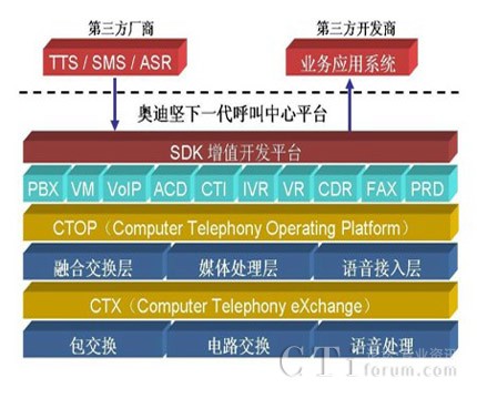 奧迪堅(jiān) IP 呼叫中心平臺(tái)的 CTOP(Computer Telephony Operating Platform) 核心技術(shù)架構(gòu)為業(yè)界最領(lǐng)先的融合交換、媒體處理和語(yǔ)音接入三層平臺(tái)應(yīng)用架 構(gòu)。值得一提的是,這一應(yīng)用架構(gòu)不僅僅針對(duì)交換機(jī)部分,而是針對(duì)呼叫中心的 PBX、ACD、CTI、IVR、錄音等所有核心功能。它們互相協(xié)同工作、有機(jī)整合, 以融合型和分布式的技術(shù)優(yōu)勢(shì)實(shí)現(xiàn)了呼叫中心應(yīng)用所需要的各種豐富的功能。