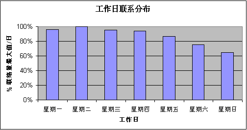 在規(guī)劃客戶服務(wù)中心規(guī)模時(shí),最困難的問題之一是:通過時(shí)間估計(jì)呼叫分配。通過一個(gè) 24 x 7 的工作安排,移動(dòng)電信公司必須按天估計(jì)他們將要處理的聯(lián)系量。下圖顯示一個(gè)移動(dòng)電信公司工作日典型的聯(lián)系分布: