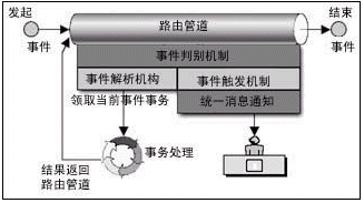 在路由管道中流轉(zhuǎn)著加載了業(yè)務(wù)的工作流事件。事件按照事先定義的路由規(guī)則流轉(zhuǎn),事件的路由規(guī)則定義了事件在路由管道中可以?康摹罢九_(tái)”,同時(shí)定義了事件到達(dá)“站臺(tái)”時(shí)可以領(lǐng)取并處理加載在事件上的業(yè)務(wù)的角色。事件從始發(fā)站臺(tái)進(jìn)入路由管道,經(jīng)過(guò)一個(gè)或多個(gè)中間站臺(tái),最后到達(dá)終點(diǎn)站。事件每?恳粋(gè)站臺(tái),相關(guān)人員領(lǐng)取事務(wù),并進(jìn)行處理后重新裝載事務(wù),觸發(fā)事件向下一個(gè)站臺(tái)流轉(zhuǎn),除非事件已經(jīng)到達(dá)終點(diǎn)站。