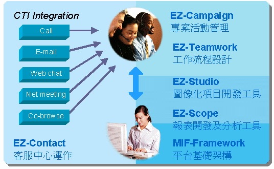 EZ-Contact最主要是為客服中心的運作及服務流程提供一套完整的全方位、多功能的解決方案,其功能細分如下: