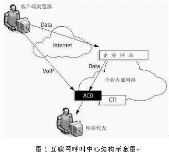 互聯(lián)網(wǎng)呼叫中心是在互聯(lián)網(wǎng)技術(shù)飛速發(fā)展的基礎(chǔ)上所產(chǎn)生的。對于客戶而言,完全的互聯(lián)網(wǎng)呼叫中心和傳統(tǒng)呼叫中心最大的區(qū)別就在于客戶無需電話,只要從一個Web站點就可以直接進(jìn)入互聯(lián)網(wǎng)呼叫中心。這樣一來,呼叫中心就從傳統(tǒng)形式上的“撥號-交談(Dial to Talk)”發(fā)展到現(xiàn)代形式的“點擊-交談(Click to Talk)”。典型的互聯(lián)網(wǎng)呼叫中心結(jié)構(gòu)如圖1所示。