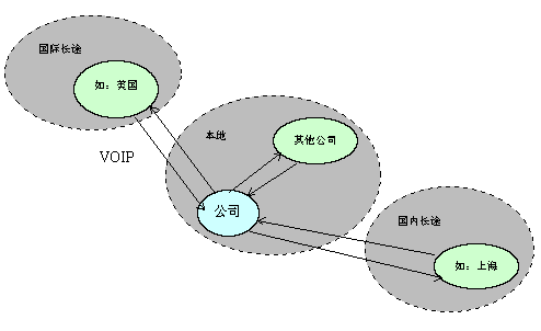 (1) 對于本地其他公司或個(gè)人:可以利用VOIP或市話接入公司,再轉(zhuǎn)入國內(nèi)長途或者國際長途。