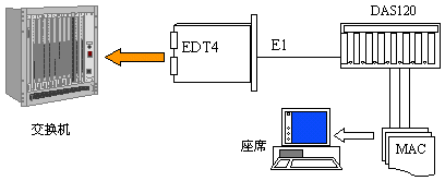 見下圖:DAS120主機通過4個E1接口與交換機直接連接,可方便地實現(xiàn)本地座席接入。遠端分布式接入則需要通過傳輸設備,它們可為光纖,微波,HDSL等。終端可為座席卡和電話機。