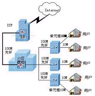 寬帶小區(qū)網(wǎng)絡(luò)建設(shè)采用基于三層交換的千兆以太技術(shù),在小區(qū)核心引入帶光口的千兆以太網(wǎng)交換機(jī),通過(guò)光纖以千兆速率上連至ISP接入?yún)^(qū)域交換機(jī)。小區(qū)內(nèi)部形成星型結(jié)構(gòu),每棟單元樓內(nèi)放置帶百兆光口的以太網(wǎng)交換機(jī),通過(guò)百兆光纖將小區(qū)核心和單元樓連接起來(lái)。樓宇內(nèi)部布放五類線,連至用戶計(jì)算機(jī)的網(wǎng)卡,使最終用戶上網(wǎng)速率達(dá)到10M或更高。
