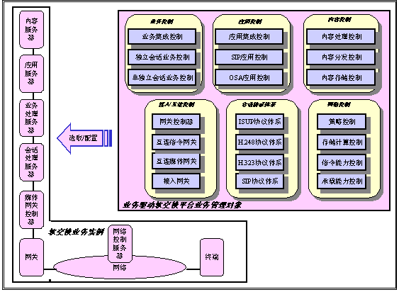 我們已經看到,軟交換技術支持的電信業(yè)務能力一直在不斷發(fā)展,開發(fā)新的電信業(yè)務已經成為電信運營商市場競爭的重要條件。事實上,業(yè)務能力是電信運營商或是電信用戶關心的基本問題,而不是實現這種業(yè)務的具體的技術和體系結構。選擇何種技術和結構,則是電信運營商依據自有的資源做出的選擇。因此,業(yè)務驅動的軟交換平臺需要根據實際的情況選取合適的技術和結構實現所需的業(yè)務。我們把實現電信業(yè)務中涉及的要素稱為業(yè)務管理對象。軟交換平臺涉及到以下的六類業(yè)務管理對象:會話協(xié)議體系、接入/互連控制、業(yè)務控制、應用控制、內容控制和網絡控制。會話協(xié)議體系是任何電信業(yè)務的基礎。對接入、互聯(lián)、業(yè)務、應用和內容的控制也是建立電信業(yè)務所必需的。網絡控制涉及到一個新業(yè)務和網絡全局的關系。除了平臺管理業(yè)務之外,每個業(yè)務管理對象均包含一個可選擇/可設計的集合,供業(yè)務設計時使用。所有這些業(yè)務管理對象的集合,構成了業(yè)務驅動軟交換平臺的控制功能的整體。下圖給除了業(yè)務驅動軟交換平臺上的業(yè)務管理對象,以及從這些業(yè)務管理對象映射的軟交換系統(tǒng)實例。