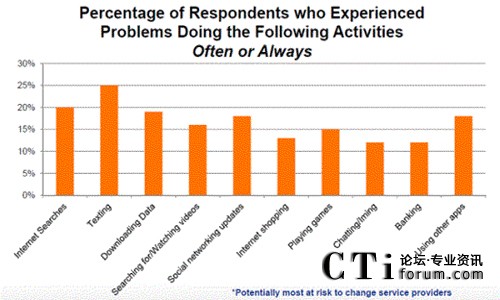 調(diào)查顯示,超過2/3的美國智能手機用戶從事一些最常見的活動時,遭遇了網(wǎng)絡(luò)服務(wù)問題,包括互聯(lián)網(wǎng)搜索、數(shù)據(jù)下載、搜尋或觀看視頻和社交網(wǎng)絡(luò)。此外,在調(diào)查中發(fā)現(xiàn),當(dāng)他們遇到服務(wù)和中斷問題時,消費者把責(zé)任歸罪于他們的移動網(wǎng)絡(luò)運營商商(MNO)。事實上,幾乎所有被調(diào)查的智能手機用戶的一半,由于他們的體驗問題抱怨他們的移動網(wǎng)絡(luò)運營商商(MNO)。
