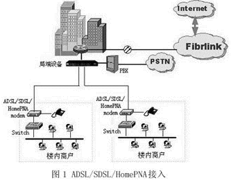 中電飛華在光纖(或其他專(zhuān)線)接入的基礎(chǔ)上提供樓宇、小區(qū)的整體接入解決方案,即在光纖接入到樓宇和小區(qū)之后,通過(guò)各種接入手段將樓內(nèi)商業(yè)用戶、小區(qū)個(gè)人用戶等接入Internet。根據(jù)樓內(nèi)/間布線情況采用不同的接入方法,包括ADSL、SDSL、HomePNA接入以及以太網(wǎng)接入等。