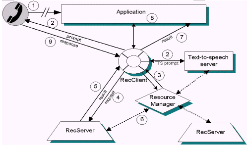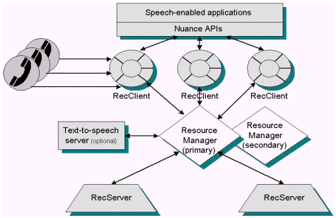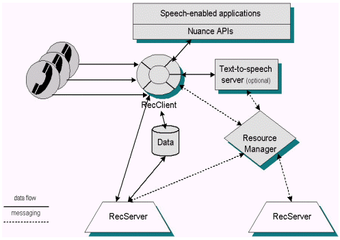 在特定配置下,呼叫控制和提示回放由Nuance系統(tǒng)外的組件控制,RecClient也可用于偷聽模式。最后,RecClient將音頻傳給識別服務(wù)器(RecServer),并將事件和結(jié)果回傳給應(yīng)用程序。