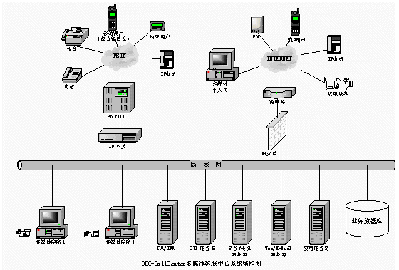 普通電話用戶通過PSTN接入DHC- UIPS綜合信息平臺系統(tǒng),接受話務(wù)員服務(wù)或自動業(yè)務(wù)流程。傳真用戶進(jìn)入系統(tǒng)可以進(jìn)行傳真業(yè)務(wù)。計算機(jī)用戶也可以通過Internet訪問企業(yè)客戶服務(wù)系統(tǒng)主頁,獲得服務(wù)。同時計算機(jī)用戶也可以通過Internet利用網(wǎng)絡(luò)電話的功能要求話務(wù)員服務(wù)或自動業(yè)務(wù)流程。