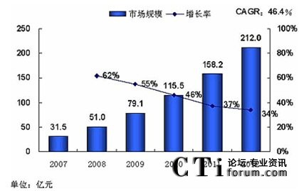 再來看看統(tǒng)一市場的前景,下圖是某咨詢公司對國內(nèi)統(tǒng)一通信市場的預(yù)測數(shù)據(jù),2012年將達(dá)到212億元,盡管可能存在一定水份,但這么多公司介入這個市場,本身就體現(xiàn)了發(fā)展?jié)摿Γ@點不容懷疑。