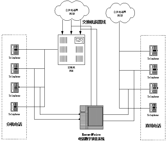 語音卡的模擬線接口和排隊機/交換機的模擬中繼并聯(lián),錄音工作站主要針對外線話音進(jìn)行錄音。