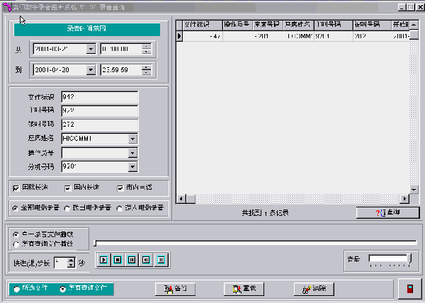 系統(tǒng)管理員可以對任一時間、任一電話的錄音進(jìn)行查詢。系統(tǒng)對每一次錄音都詳細(xì)記載了通話開始時間、結(jié)束時間、主叫或被叫號碼、通話的線路等,當(dāng)系統(tǒng)管理員在選中了某一條錄音后,可以進(jìn)行即時播放。