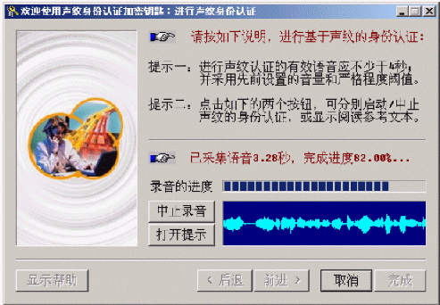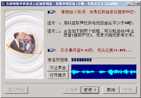 提示:如果原來已經(jīng)提取過該用戶的聲紋信息,且在"聲紋信息的提取"步驟一的窗口上不點擊"提取聲紋"而直接點擊"前進"按鈕,將使用舊的聲紋信息,而僅更新"錄音音量"和"嚴格程度閾值"的設置。
