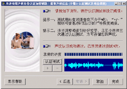 點擊"認證測試"按鈕并說出含有4秒有效語音的任意一段話,系統(tǒng)據(jù)此進行身份認證,并顯示在當前的"嚴格程度閾值"下的認證結(jié)果("通過"或"被拒絕")。根據(jù)這個結(jié)果,可利用"+/-"按鈕將這個閾值適當?shù)卣{(diào)高(如果結(jié)果是"通過")或調(diào)低(如果結(jié)果是"拒絕")一些或不做調(diào)整。請注意:該閾值越大,后續(xù)的聲紋認證就越嚴格,反之則越寬松。