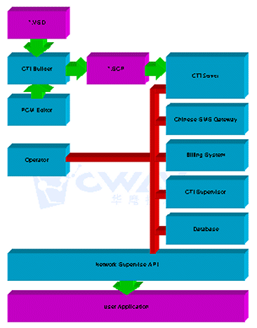 說(shuō)明:圖中所有的設(shè)備都是通過網(wǎng)絡(luò)和CTI服務(wù)器交互的,我們內(nèi)部都是通過遠(yuǎn)程監(jiān)控API接口與服務(wù)器通信,也就是說(shuō),只要用戶可以按照遠(yuǎn)程監(jiān)控API的規(guī)范開發(fā)出具有自己特色的計(jì)費(fèi)系統(tǒng)、監(jiān)控系統(tǒng)等等。