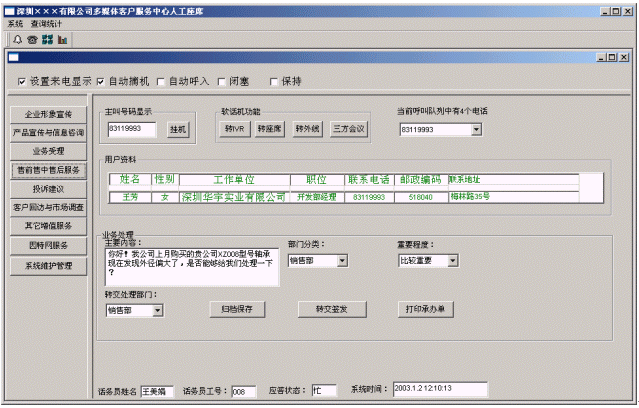 - 提高企業(yè)親切感:系統(tǒng)在人工服務(wù)狀態(tài)下,當(dāng)業(yè)務(wù)代表輸入客戶名稱時(shí),系統(tǒng)即時(shí)將客戶與企業(yè)相關(guān)的信息顯示在座席終端上,使業(yè)務(wù)及時(shí)了解客戶,有針對(duì)性回答客戶問題,使客戶倍感親切。