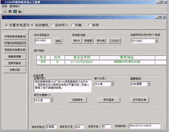 12369環(huán)保熱線系統(tǒng)將接入功能、導(dǎo)航功能、自動(dòng)語(yǔ)音查詢(xún)功能、人工座席服務(wù)功能、話(huà)路轉(zhuǎn)接功能、信息資料處理緊密聯(lián)系起來(lái)。用戶(hù)撥打特服電話(huà)號(hào)碼后,可以根據(jù)需要選擇人工服務(wù)、自動(dòng)語(yǔ)音查詢(xún)、自動(dòng)留言,并能夠在幾種服務(wù)中來(lái)回切換或轉(zhuǎn)接其它電話(huà);所記錄的資料可以分門(mén)別類(lèi)的進(jìn)行統(tǒng)計(jì)并形成報(bào)表,供相關(guān)部門(mén)進(jìn)行檢索查閱;意見(jiàn)處理完畢,可由座席主動(dòng)呼叫用戶(hù),告知處理意見(jiàn),形成閉環(huán)處理流程。