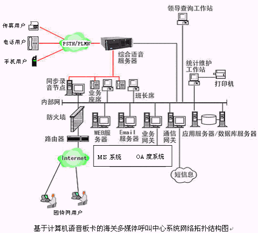 本多媒體呼叫中心的物理結(jié)構(gòu)由帶語音板卡的高工控機(jī)、CTI服務(wù)器、IVR(交互式語音應(yīng)答)/IFR(交互式傳真應(yīng)答)服務(wù)器、業(yè)務(wù)代表座席(邏輯上分為:普通業(yè)務(wù)代表座席、專家座席、WEB座席等)、班長座席/質(zhì)檢座席、統(tǒng)計(jì)維護(hù)管理工作站、因特網(wǎng)(WEB)服務(wù)器、電子郵件(EMAIL)服務(wù)器、數(shù)據(jù)庫/應(yīng)用服務(wù)器、錄音留言工作站、領(lǐng)導(dǎo)查詢工作站、業(yè)務(wù)網(wǎng)關(guān)服務(wù)器、通信網(wǎng)關(guān)服務(wù)器、網(wǎng)絡(luò)系統(tǒng)等和應(yīng)用軟件構(gòu)成。