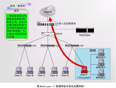 上圖中,NetSniper-II可以對(duì)網(wǎng)絡(luò)內(nèi)部各用戶(hù)進(jìn)行檢測(cè),一旦發(fā)生某個(gè)用戶(hù)安裝代理服務(wù)器軟件,其他用戶(hù)通過(guò)該用戶(hù)的接口上網(wǎng)偷逃網(wǎng)費(fèi)的情況,或發(fā)現(xiàn)盜用MAC地址上網(wǎng)及通過(guò)Modem回?fù)苌暇W(wǎng)的情況,NetSniper-II即可定位這些用戶(hù),并且采取通知系統(tǒng)管理員或自動(dòng)封堵非法用戶(hù)等措施。