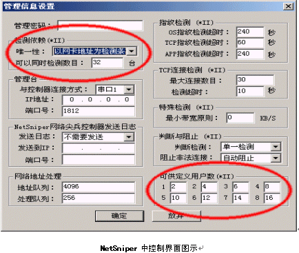 由上圖我們可以看出,NetSniper可以方便地根據(jù)用戶(hù)IP地址或MAC地址控制同一網(wǎng)口用戶(hù)數(shù)量,用戶(hù)數(shù)量控制可以分八級(jí),包括單一用戶(hù)和無(wú)限用戶(hù)的缺省設(shè)置,一共十級(jí)。用戶(hù)數(shù)量按照按自己的意愿定義每一級(jí)用戶(hù)可以管理計(jì)算機(jī)的數(shù)量,準(zhǔn)確,靈活,是運(yùn)營(yíng)商增加接入服務(wù)方式的強(qiáng)大基礎(chǔ)。