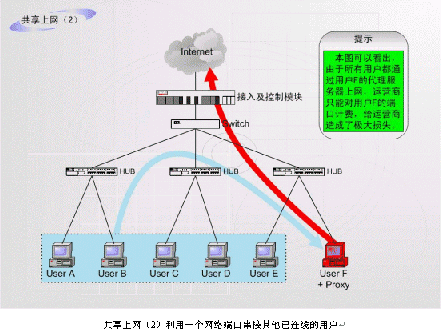 非法運(yùn)營(yíng)情況之二:如上圖中的F用戶(hù)作為運(yùn)營(yíng)商的合法包月用戶(hù),上網(wǎng)服務(wù)開(kāi)通以后,在自己的計(jì)算機(jī)中安裝代理服務(wù)軟件或者安裝路由器,這樣就可以隨時(shí)糾集若干住戶(hù)分?jǐn)偘沦M(fèi)用,甚至私設(shè)網(wǎng)吧。