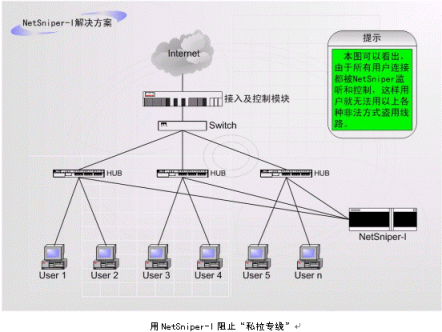 NetSniper-I適用于檢測(cè)和控制私拉專(zhuān)線(xiàn)。NetSniper-II適用于檢測(cè)和控制共享上網(wǎng)和盜用MAC地址上網(wǎng)。