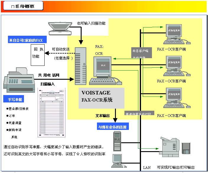能夠大范圍地建立起從簡(jiǎn)便的的熨臺(tái)型4條回線(xiàn)系統(tǒng)到最大320條回線(xiàn)客戶(hù)端?服務(wù)器的大規(guī)模網(wǎng)絡(luò)。采用高性能的OCR引擎即使是不標(biāo)準(zhǔn)的手寫(xiě)文字也能正確識(shí)別。 依靠學(xué)習(xí)功能和辭典的知識(shí)處理, 越加使用越能提高識(shí)別率。