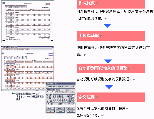 ·輸入單據(jù)的定義自如對(duì)于制作OCR帳票及能夠輸入項(xiàng)目數(shù)的設(shè)定、不需要專(zhuān)業(yè)知識(shí)和經(jīng)驗(yàn)。使用鼠標(biāo)的對(duì)話(huà)形式、能簡(jiǎn)單地完成準(zhǔn)備。