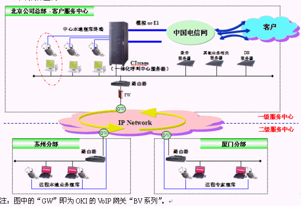 另一方面,OKI則擁有構(gòu)筑大規(guī)模IP電話的豐富經(jīng)驗(yàn),從最初的窄帶網(wǎng)絡(luò)到最近的寬帶網(wǎng)絡(luò),OKI一直在提供著最適合使用用戶環(huán)境的、追求音質(zhì)的VoIP產(chǎn)品。伴隨著寬帶網(wǎng)絡(luò)在企業(yè)市場(chǎng)中日益深入的運(yùn)用,及呼叫中心市場(chǎng)中呈現(xiàn)的最新需求,OKI充分將IP技術(shù)運(yùn)用到呼叫中心系統(tǒng)中,推出IP型分散客服中心解決方案。所謂分散型系統(tǒng),是指用網(wǎng)絡(luò)將分散在各個(gè)點(diǎn)的多個(gè)呼叫中心連接起來(lái),作為一個(gè)大規(guī)模中心統(tǒng)一運(yùn)用的系統(tǒng)。