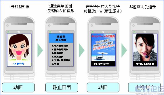 以往的IVR根據(jù)選擇項、層數(shù),必須多遍聽取語音內容才能找到預期的菜單,成了一大課題。視頻呼叫中心則在FOMA的畫面上顯示服務菜單,通過選擇號碼可以簡化聽取語音的過程。而且,在連接客服人員的電話等待時間中可以播放廣告。通過靈活運用這些功能,提高了IVR的操作性,提供了新型廣告宣傳的機會。